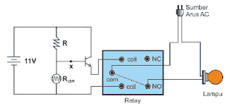 22. Desain rangkaian elektronik berikut menunjukkan sebuah rangkaian lampu otomatis yang digunakan Masjid Darussalam Bandung. Lampu otomatis ini akan menyala saat kondisi lingkungan gelap dan padam saat kondisi lingkungan terang.