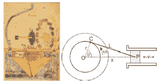 20. Dalam Kitab fi ma’rifat al-hiyal alhandasiya, Abu al-‘Izz ibn Isma’il ibn ar- Razaz al-Jazari (1136–1206 M) membuat sistem engkol-piston sebagai penggerak pompa air. Dalam teknologi modern sistem engkol-piston diadopsi dalam berbagai mesin berbahan bakar. Berikut adalah gambar karya al-Jazari dan model mekanisme sistem engkol-piston. Lingkaran engkol dapat bergerak rotasi dengan kecepatan sudut ω terhubung dengan piston yang bergerak translasi dengan kecepatan 𝑣. Berdasarkan desain tersebut, diketahui jari-jari engkol sebesar r, batang penghubung engkol dan piston panjangnya adalah L. Kecepatan translasi piston sepanjang garis x adalah…