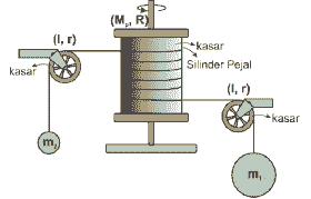 Diketahui pada sistem, m1 >>m2kedua katrol identik dengan momen inersia l dan berjari-jari r, sedangkan batang putar berbentuk silinder pejal bermassa Mp dan berjari-jari R. Asumsikan katrol dan batang putar kasar sehingga dapat berotasi. Jika awalnya batang putar tersebut diam, dengan Өo = 0, ωo = 0, serta percepatan gravitasi g, kemudian sistem bergerak sehingga batang putar mulai berotasi dengan percepatan sudut tetap, maka kecepatan sudut batang putar ωt saat batang putar menempuh sudut Өt adalah…