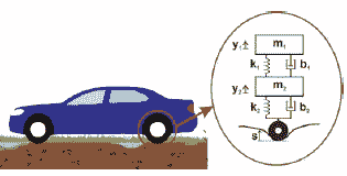 Jika M1 adalah massa seperempat bagian badan mobil, M2 adalah massa sistem suspensi, k1 adalah konstanta pegas sistem suspensi, k1 adalah konstanta pegas sistem ban dan roda, b1adalah konstanta redam sistem suspensi, b1 adalah konstanta redam sistem ban dan roda, s adalah posisi input jalan berbatu bergelombang tak beraturan, y adalah posisi massa yang berosilasi, vy adalah kecepatan massa karena perubahan y, serta vs adalah kecepatan karena perubahan posisi input jalan berbatu bergelombang (Catatan: Kondisi awal keseimbangan, gaya gravitasi diimbangi dengan gaya pegas untuk melawan gravitasi sehingga gaya gravitasi dan gaya pegas yang melawannya dalam hal ini diabaikan dan gaya yang bekerja pada mobil adalah hanya gaya pegas yang timbul karena jalan berbatu -ky dan gaya redam -by). Percepatan massa M1 dan massa M2 saat mobil bergerak adalah…