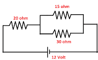 cara menentukan arus pada rangkaian resistor campuran 1 seri dan 2 paralel yang dihubungkan dengan arus searah / DC: