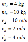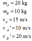 Dua buah benda bergerak seperti gambar di samping. Jika kemudian terjadi tumbukan lenting sempurna sehingga kecepatan benda A dan benda B setelah tumbukan berturut-turut 10 m/s dan 20 m/s maka kecepatan benda B sebelum tumbukan adalah … m/s.