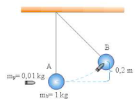Sebutir peluru yang massanya 0,01 kg ditembakkan pada suatu ayunan balistik bermassa 1 kg, sehingga peluru bersarang di dalamnya dan ayunan naik setinggi 0,2 m dari kedudukan semula. Jika g = 10 m/s², kecepatan peluru yang ditembakkan adalah….