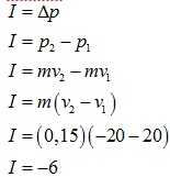 Sebuah bola pada permainan softball bermassa 0,15 kg dilempar horizontal ke kanan dengan kelajuan 20 m/s. Setelah dipukul, bola bergerak ke kiri dengan kelajuan 20 m/s. Impuls yang diberikan oleh kayu pemukul pada bola adalah ….