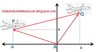 Pesawat semula berada pada titik P(-8.4) dan 30 detik kemudian pesawat sudah beraaa di titik Q(4,8) (kecepatan pesawat diasumsikan konstan dan ketinggian pesawat setelah di titik Q tidak berubah). Letak koordinat pesawat diilustrasikan seperti gambar di atas dan Kedudukan pesawat dapat diwakili oleh vektor – vektor .