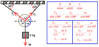 - Tentukan besar sudut a, b dan c . a adalah sudut dibalik gaya / tegangan tali A